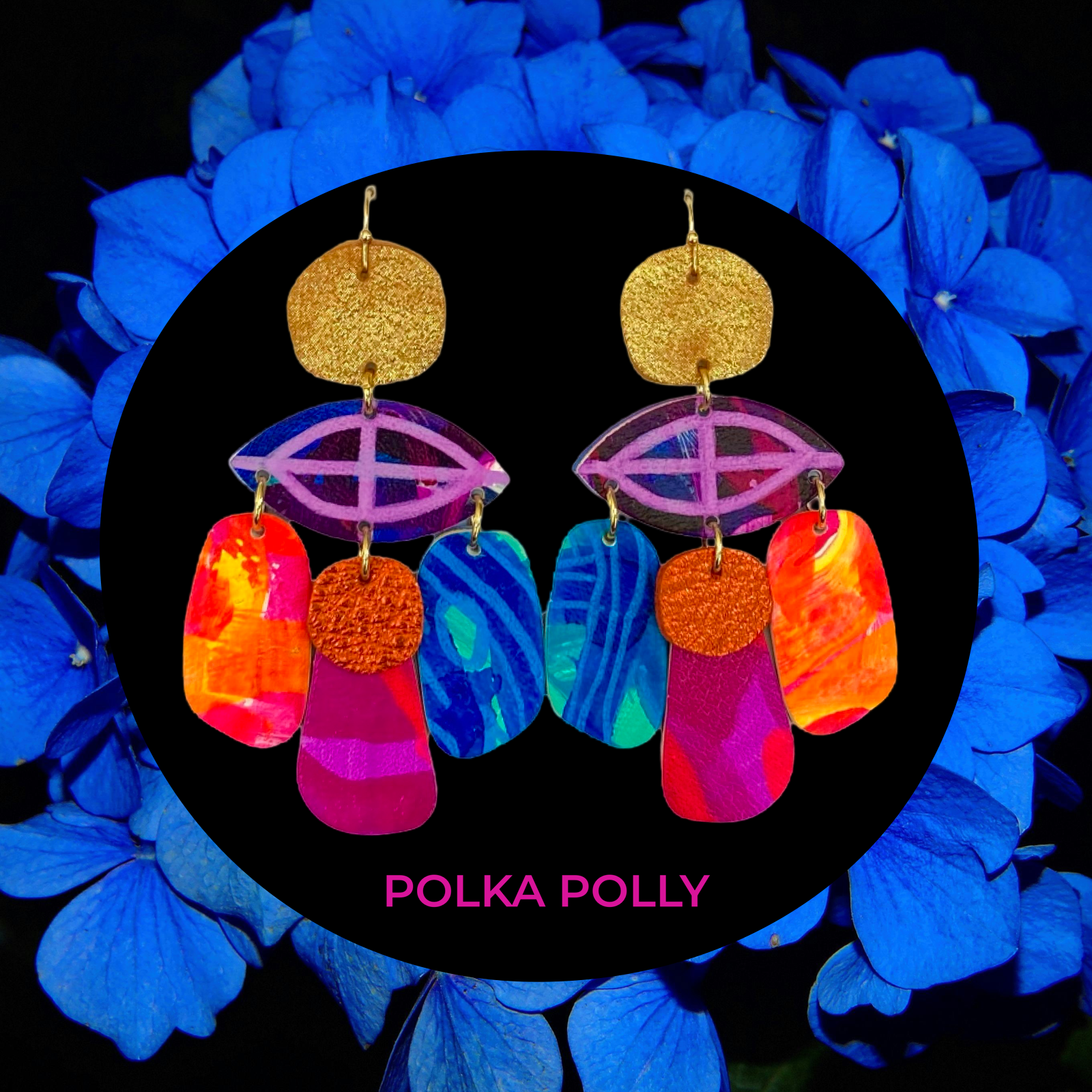 Bright hand painted leather in contrasting colours and patterns with hints of metallics.