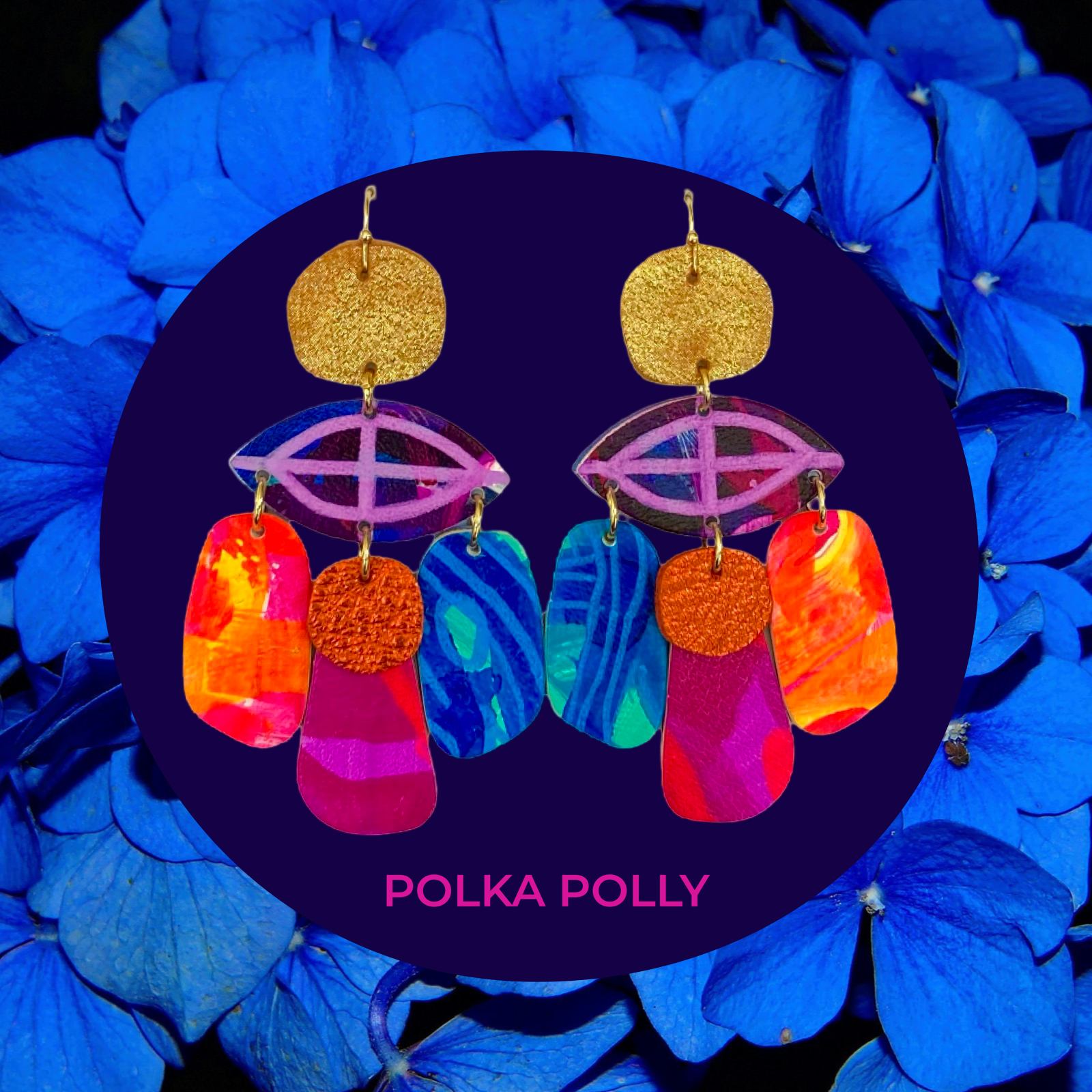 Bright hand painted leather in contrasting colours and patterns with hints of metallics.
